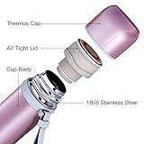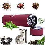 THERMOS - Builtin tea hook easily holds tea bags or most loose leaf infusers Thermos vacuum insulation technology for maximum temperature retention hot or cold Durable stainless steel interior and exterior Fits most automobile cup holders single serve compatible Cool to the touch with hot liquids sweatproof with cold