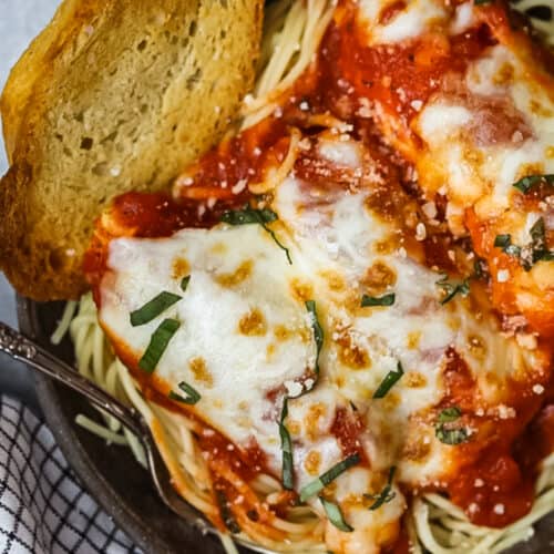 I’ve used spaghetti for this chicken parm, that being said, you can really use any type of pasta you like, chicken parmesan served with penne pasta, orzo pasta or even a side of tortellini. Whatever takes your fancy!
