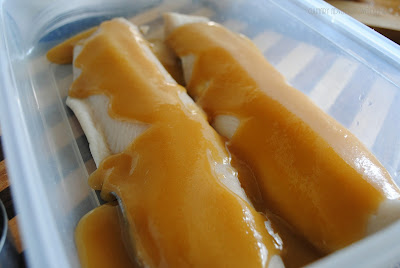 When you're ready to cook, preheat the oven to broil with a rack about 4" from the heating element. Wipe off most of the marinade and slice each filet in half so you have four 1/4 pound filets.