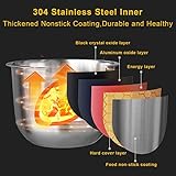 Strongest healthiest ceramic nonstick interior coating plastic ptfe and pfoa free for even heat distribution fully sealed environment seals in the flavors nutrients and aromas within the food to healthy stainless steel 1810 inner cooking pot made from food grade 304 ss no chemical coating 3ply bottom for even heat distribution fully sealed environment traps the flavors nutrients and aromas within the food German engineered to last unlike other models our cooker is made with high quality rubber seals strong reliable heat resistant handles and internal electronics made to stand the test of time