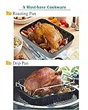 KAMaster - Matched with multiple racksthe drip pan can used with roast rack designed to rest at the ideal height within the roaster keeping the food cooking out of oils and excess juicesThe rack include rib rackv rackceramic steamer and vertical roasterKeep the food from additional liquid such as oil blood water or cool the chicken Cooking various foodperfect for roasting meats chickenturkey poultryfish and vegetablesThis roasting pan is a multipurpose pan and is absolutely great for party and everyday cooking