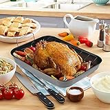 The 18 x 12 x 3inch jumbo roaster is perfect for turkeys roasts lasagna and large casseroles It has the extra capacity and stability for large portions Ceramic nonstick technology provide a greater bakingroasting experience Double coated ceramic surface over 07 mm carbon steel provides long lasting durability and scratch resistance Heat tolerance to 450 f no peel off or blistering in high temperatures
